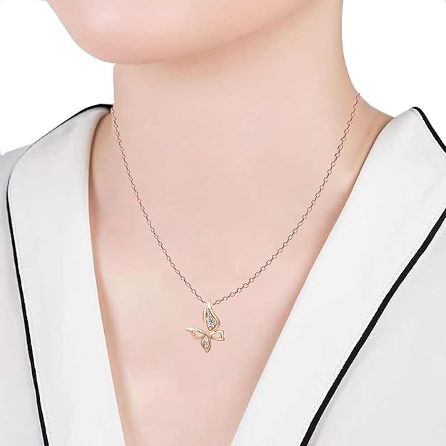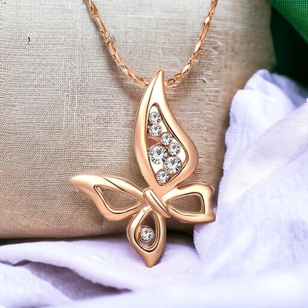 Rose Gold Plated Enchanting White Crystals Wispy Butterfly Pendant Necklace Suited For Women & Girls
