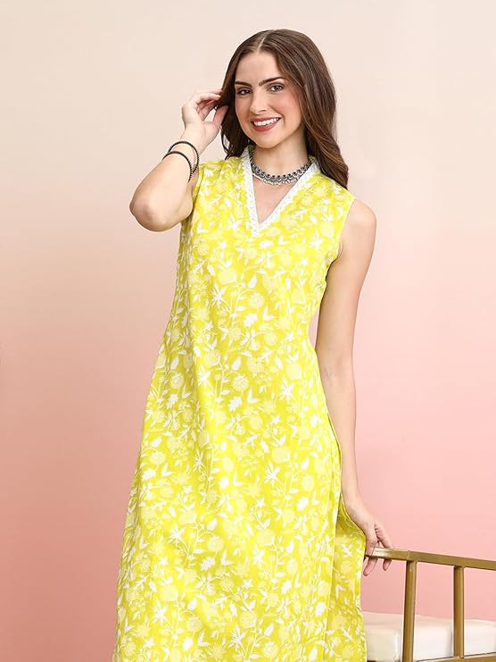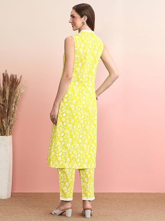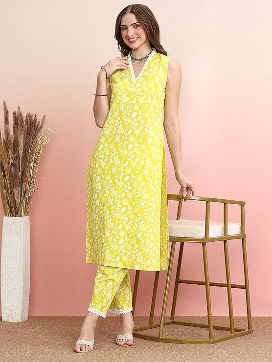 Color :- Green || Top & Bottom Fabric :- Pure Cotton Top Pattern :- Printed || Bottom Pattern :- Printed || Print Type :- Floral Top Length :- Calf Length || Sleeve Length :- Sleeveless || Top Shape :- Straight || Neck Type :- V-Neck Package Contains : Kurta & Pant Set (Pack of 2) Note :- Product color might slightly vary due to photographic lighting sources or your monitor settings.