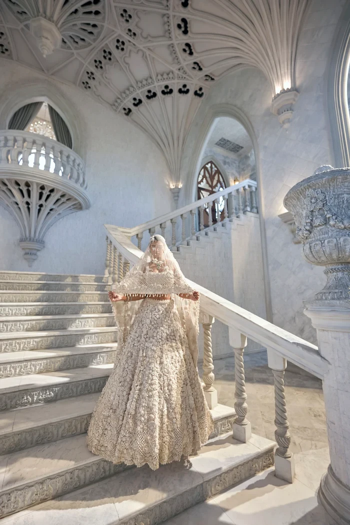 This lehenga set features heavy three-dimensional cut work embroidery in crystal, thread, pearl and sequin. The blouse shows embroidery in checkered pattern with long pearl tassels at the waist and at the back. It is paired with the heavily embroidered dupatta shows a combination of three borders, floral motifs and pearl tassels all over. It comes with an optional embroidered veil.