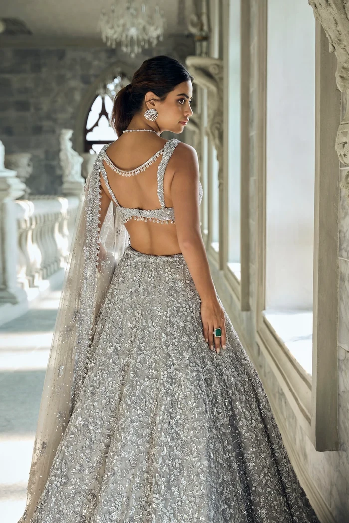 This lehenga set features embroidery in tonal, silver sequin and crystal on a silver net base. The strappy blouse has delicate crystal tassels at the hem. It is paired with a four sided embroidered net dupatta.