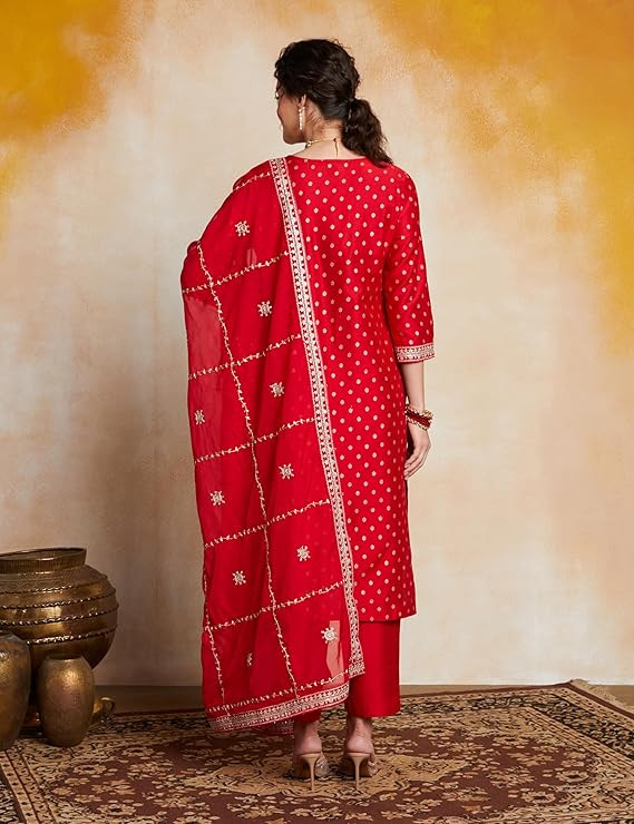 FABRIC: Soft, breathable fabric with excellent drape and subtle shine, designed for all-day comfort and festive elegance. PRODUCT DETAILS: 3-piece set featuring round neck regular fit kurta with 3/4th sleeves, zari embroidery at yoke and cuff, all-over gold khadi print, paired with straight fit pyjama with side pocket and embroidered dupatta. WORKMANSHIP: Crafted with high quality stitching and adorned with premium embellishments, ensuring lasting quality. STYLE TIPS: Pair with with statement jewellery and heels for your special occasions. FIND YOUR PERFECT FIT: Please refer to the 5th image in our catalogue for a detailed size and fit guide. SUSTAINABILITY COMMITMENT: This product is made in a certified factory that is committed to ethical labour practices. We use FSC certified tags and re-cycled packaging.