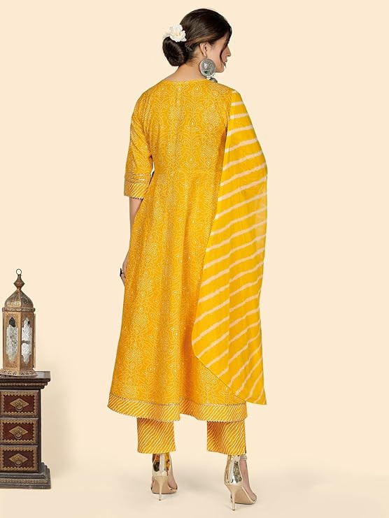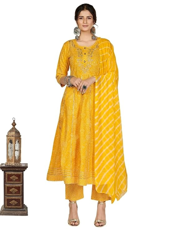 Vibrant Design: The Women's Bandhani & Embroidered Anarkali Cotton Yellow Stitched Kurta Pant With Dupatta set features a stunning Bandhani print and intricate embroidery, creating a vibrant and traditional look. Comfortable Cotton Fabric: Made from high-quality cotton, this set ensures maximum comfort and breathability, making it perfect for all-day wear. Classic Silhouette: The Anarkali kurta with a round neck and 3/4 sleeves offers a timeless and flattering fit, suitable for various body types and occasions. Complete Set: This ensemble includes a stitched Anarkali kurta, matching pants with a convenient pocket, and a coordinating dupatta, providing a cohesive and stylish outfit. Versatile Occasion Wear: Ideal for festive celebrations, family gatherings, and casual outings, this yellow set adds a touch of elegance and sophistication to any event.