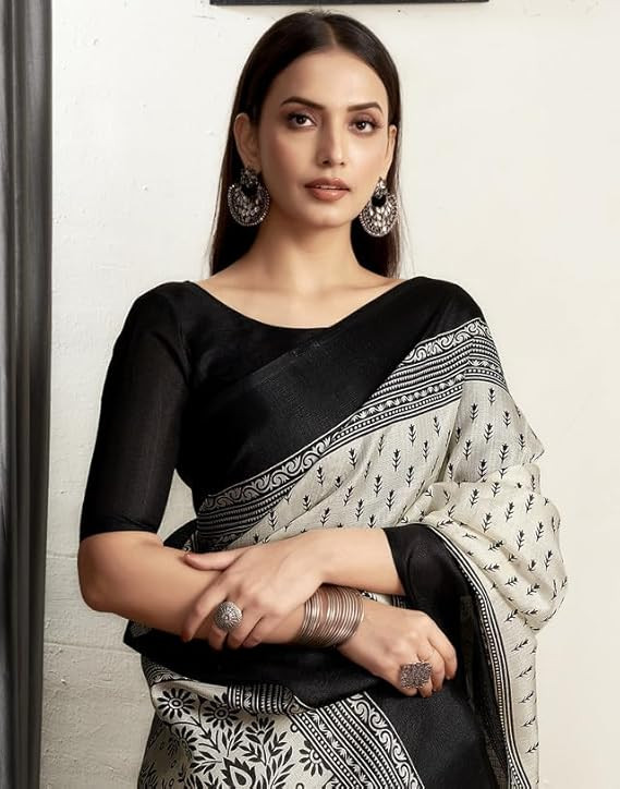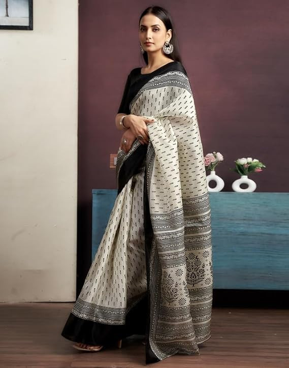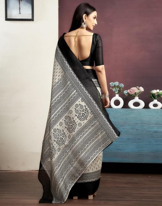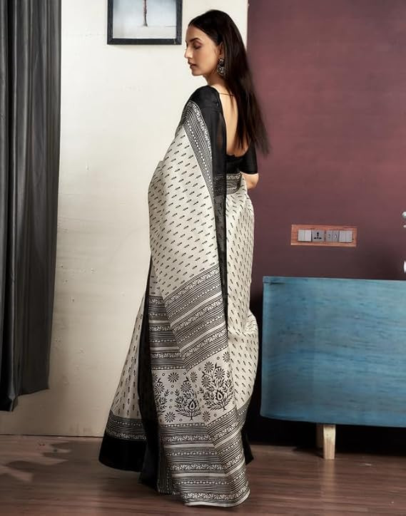 • Saree Fabric: Cotton | Blouse Fabric:Cotton | Work:: Saree: Printed | Blouse: Solid | Colour:: Saree Color: Off White & Black | Blouse Color: Black