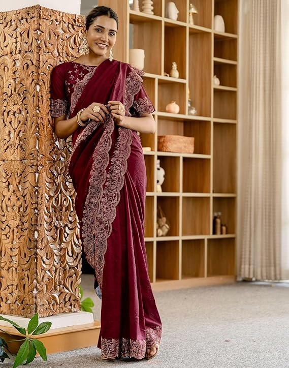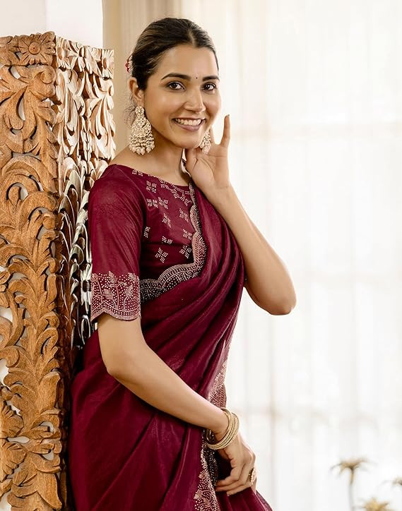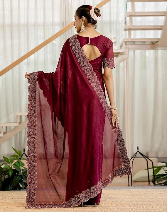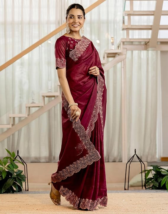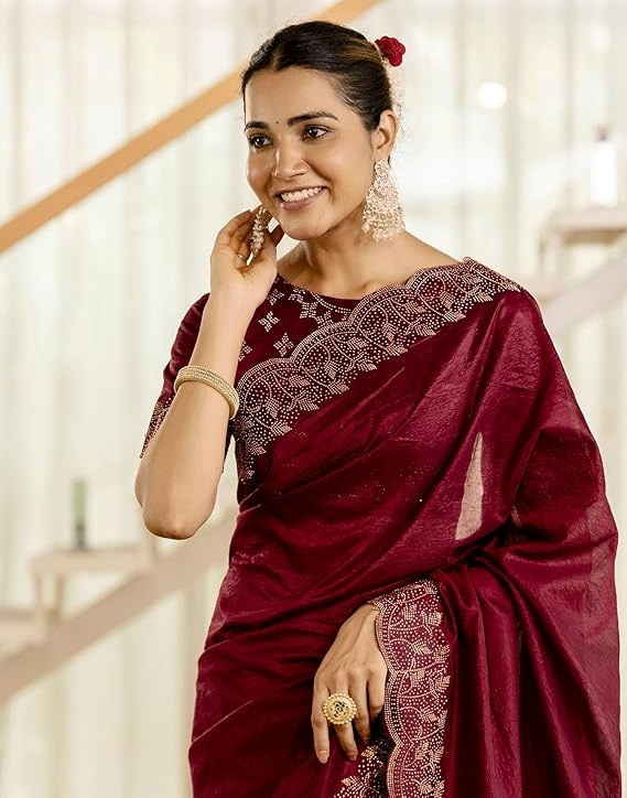 Women's Tissue Crush Stone Work And Scalloped Border Saree With Unstitched Blouse