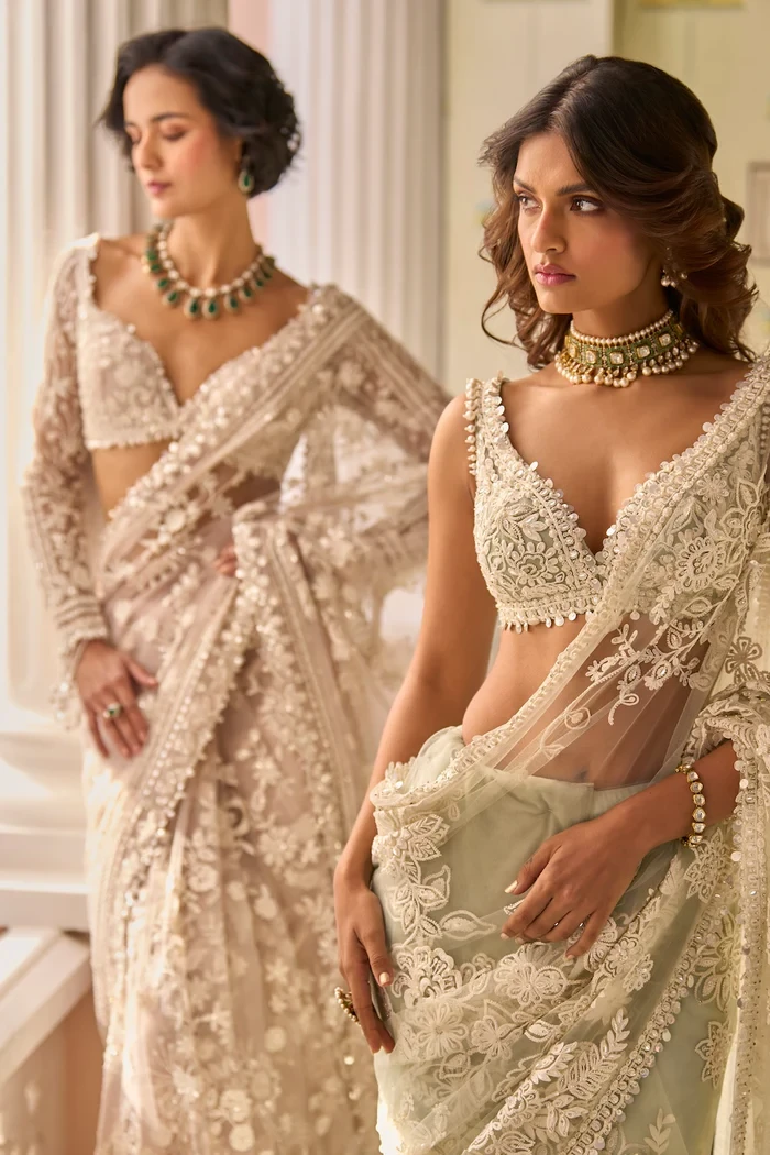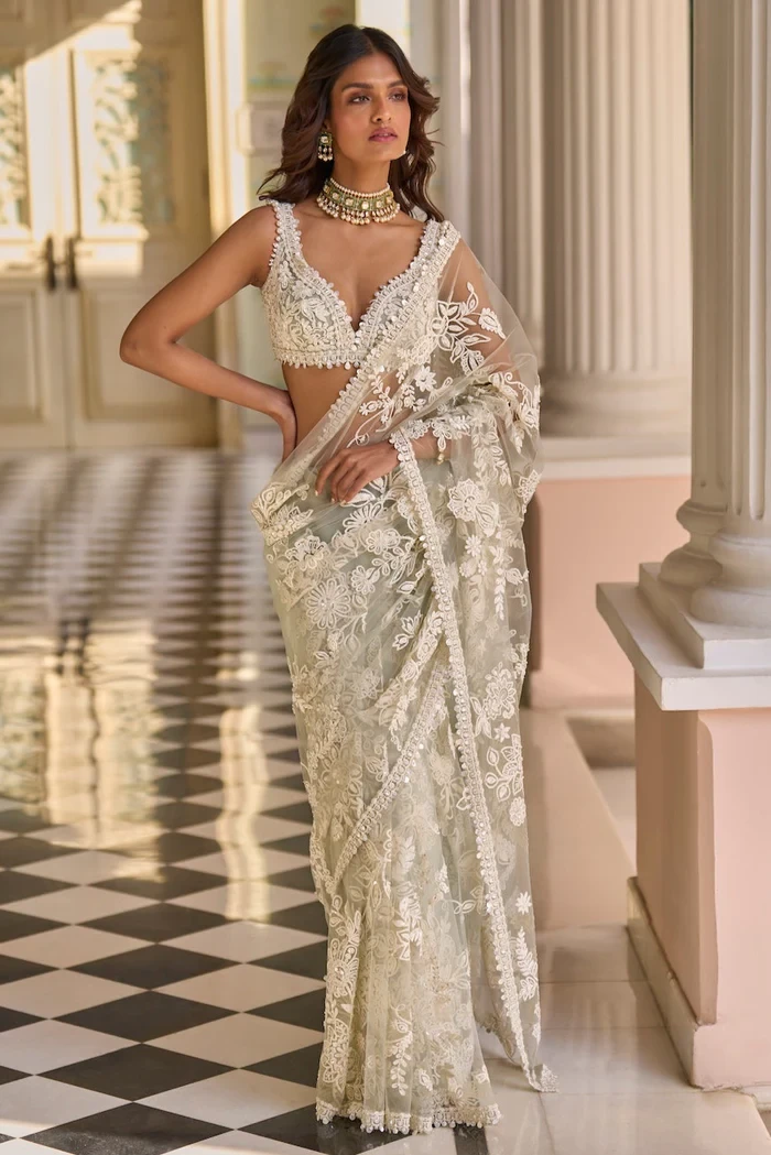 This saree features ivory thread and sequin embroidery on a mint green net base. The embroidered blouse shows plunging neckline with scalloped detailing and tassels on the neck and hem.