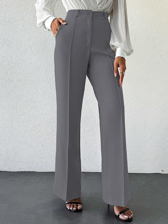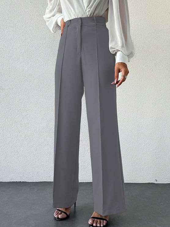 Women's High Rise Solid Color High Waist, Wide Straight-Leg Loose Fit, Front Button Closure, Simple Daily Casual Long Pants with Pockets (Without Belt) (Trouser